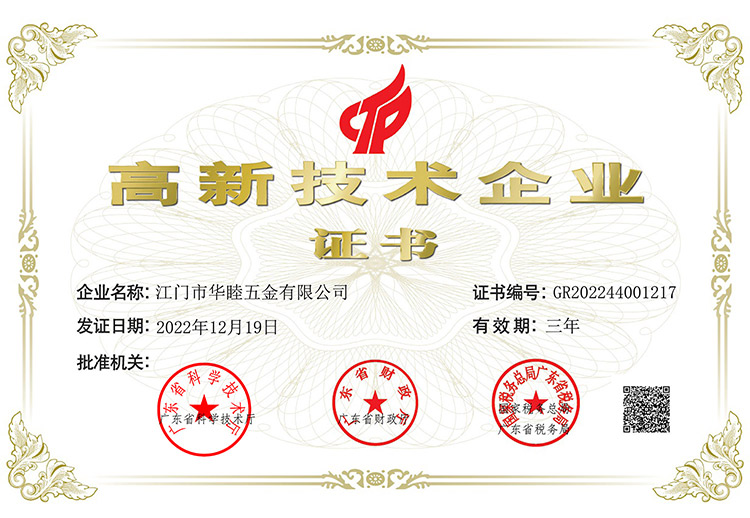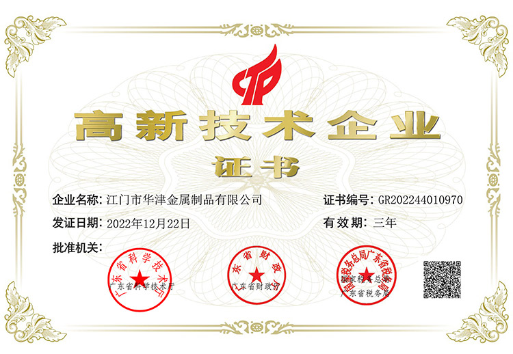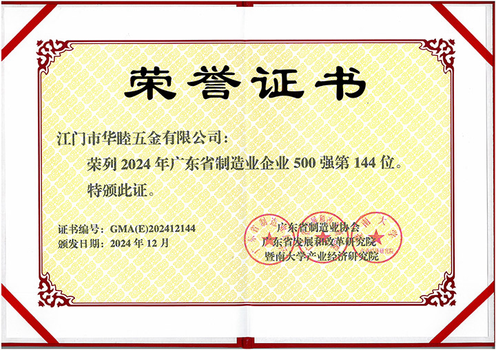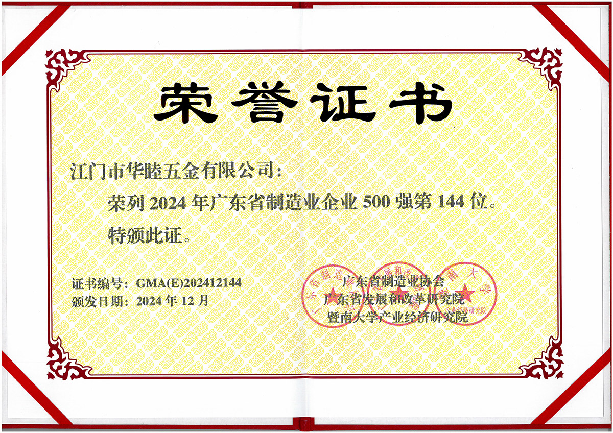 集團創(chuàng)建以來,社會各界對華津的企業(yè)發(fā)展給予了充分的肯定和高度的評價。華津榮列2024年廣東省制造業(yè)企業(yè)500強第102位,華睦榮列2024年廣東省制造業(yè)企業(yè)500強第144位,并且先后榮獲:國家高新技術(shù)企業(yè)、廣東省工程技術(shù)研究中心、廣東省名牌產(chǎn)品、江門市工程技術(shù)研究中心、標準化工作AAA級企業(yè)、江門企業(yè)百強等稱號。