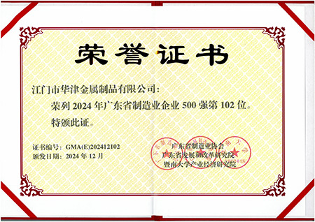 Jiangmen Huajin Metal Products Co., Ltd. and Jiangmen Huamu Hardware Co., Ltd., subsidiaries of Huajin Group, have been listed among the "Top 500 Manufacturing Enterprises in Guangdong Province in 2024" by virtue of their strong strength and outstanding quality.
