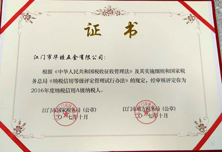2017年10月,本公司之公司江門(mén)華津金屬制品有限公司(以下簡(jiǎn)稱(chēng)“華津”)及江門(mén)市華睦五金有限公司(以下簡(jiǎn)稱(chēng)“華睦”)收到江門(mén)市國(guó)家稅務(wù)局及江門(mén)市地方稅務(wù)局所頒發(fā)的《2016年度納稅信用A級(jí)納稅人證書(shū)》。