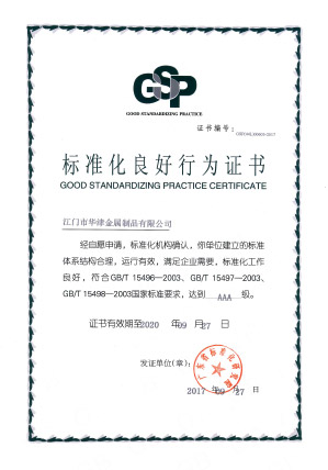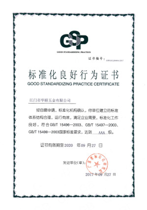 2017年9月27日,本公司之公司江門華津金屬制品有限公司(以下簡稱“華津”)及江門市華睦五金有限公司(以下簡稱“華睦”)收到由廣東省標(biāo)準(zhǔn)化研究院所頒發(fā)的《標(biāo)準(zhǔn)化良好行為證書》(證書編號(hào)分別為:GSP(44L)00603-2017 號(hào)及GSP(44L)00604-2017號(hào))。