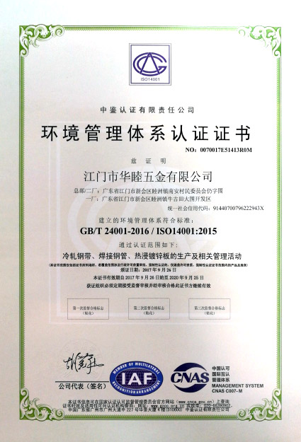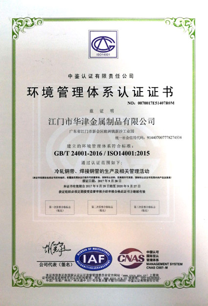 2017年9月,本公司之公司江門華津金屬制品有限公司(以下簡(jiǎn)稱“華津”)及江門市華睦五金有限公司(以下簡(jiǎn)稱“華睦”)分別收到由中鑒認(rèn)證有限責(zé)任公司所頒發(fā)的《環(huán)境管理體系認(rèn)證證書》(證書編號(hào)分別為:0070017E51407R0M號(hào)及0070017E51413R0M號(hào))。